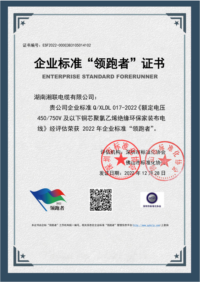 近日,湖南湘聯電纜有限公司企業標準Q/XLDL 010-2022《額定電壓 6kV(Um=7.2kV)到 35kV(Um=40.5kV)擠包石墨烯內外屏蔽交聯聚乙烯絕緣電力電纜》、Q/XLDL 016-2022《額定電壓 1kV(Um =1.2 kV)擠包絕緣電力電纜》、Q/XLDL 017-2022《額定電壓450/750V及以下銅芯聚氯乙烯絕緣環保家裝布電線》三項產品經評定機構評估,榮獲2022年全國企業標準“領跑者”。
